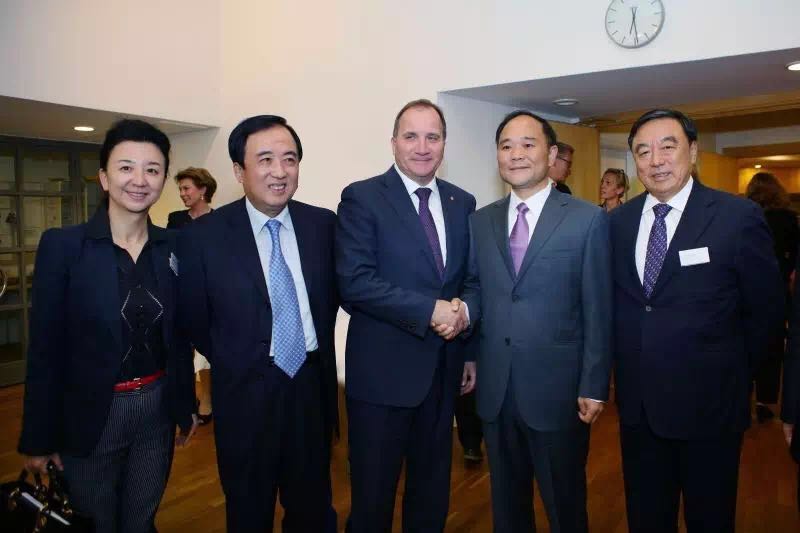 (从左至右)中国企业家俱乐部秘书长程虹、中国驻瑞典大使陈育明、瑞典首相斯特凡•勒文、金年会集团董事长李书福、中国企业家俱乐部理事长马蔚华